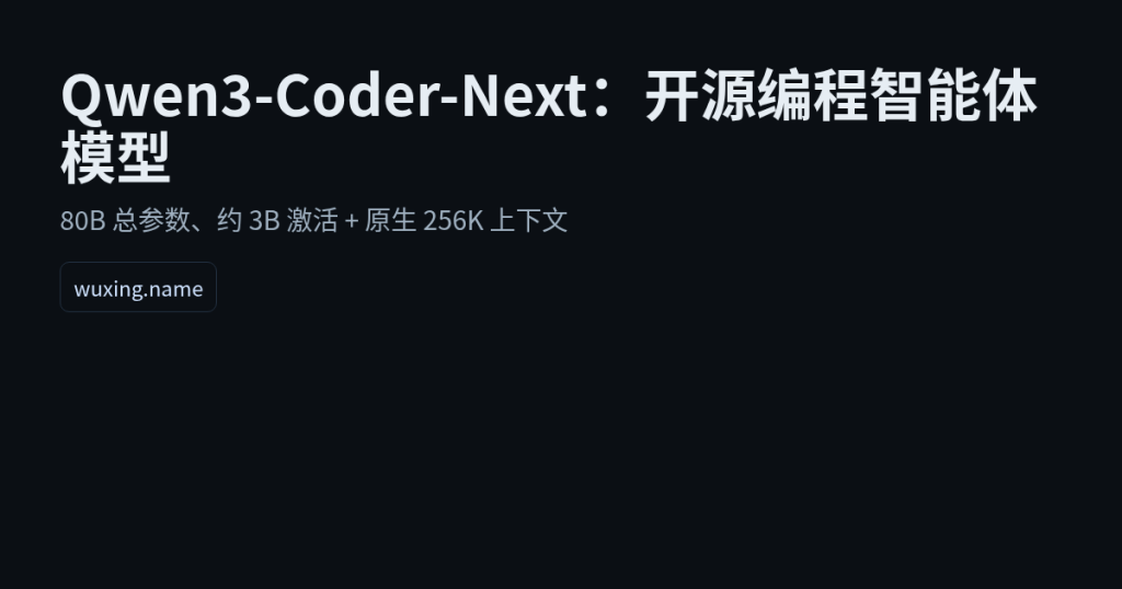 这两天,阿里巴巴通义千问(Qwen)团队在 Hugging Face 上发布了 Qwen3-Coder-Next:一款面向“编程智能体(coding agent)”的开源权重模型。它最吸引人的点不是“更大”,而是更省——总参数 80B,但每次推理只激活约 3B 参数,却宣称能做到接近更大活跃参数模型的编程效果,同时还原生支持超长上下文。
